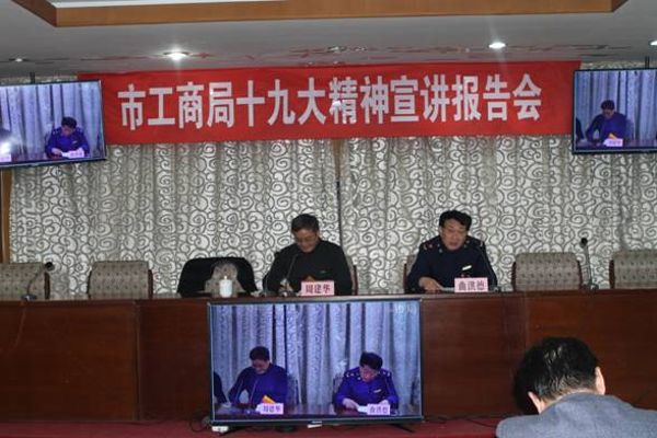 (党组成员、副局长曲洪德同志主持会议) 市局党组成员、副局长曲洪德同志主持报告会议。他指出学习宣传贯彻党的十九大精神,是当前和今后一个时期我们的主要工作和政治任务。要求全市工商系统领导干部坚持带头学习,带头宣讲,以身作则,先学一步、学深一些,切实在学习贯彻中发挥好表率作用。各单位要结合实际制定具体学习计划,明确步骤,细化措施,加强督促检查,确保学习取得实效。要紧密联系单位工作实际,联系干部群众思想实际,坚持学以致用、用以促学,切实把十九大精神落实到各自的实际工作中去。 曲局长强调,当前已经紧接年末岁尾,各项工作进入收尾阶段,要认真对照年初确定的各项目标,全面梳理各项任务的进展情况,加快推进,争取今年各项目标能够顺利实现。同时,要及早准备、及早谋划、及早启动明年工作,以党的十九大精神为指引,把明年的工作做实、做深、做新、做出成效。 报告会议以视频形式组织全市工商和市场监管系统人员收听收看,市局设主会场,各县(市、区)工商行政管理局、市场监管局设分会场。参加会议人员为:市局机关全体同志,各县(市、区)工商行政管理局、市场监管局领导班子成员及中层以上干部。