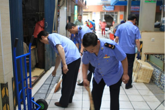 志愿服务人员打扫市场卫生,保持市场整洁。
