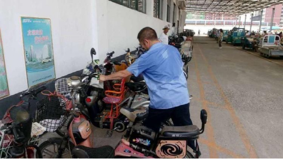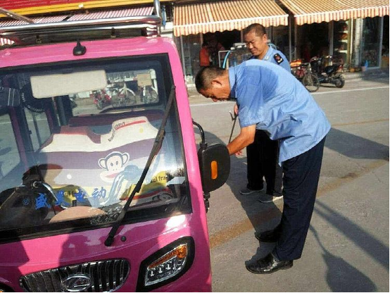 工商人员主动帮助群众修理电动三轮车。